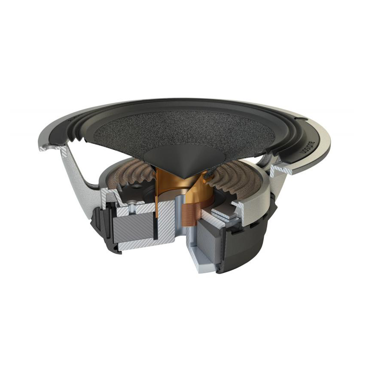 Originating directly from the experience of the Thesis line components, the Voce woofer features an aluminium basket with a great aerodynamic structure, a cotton-fibre paper pressed cone with Light Damping treatment, a Triple Wave surround in butyl rubber and extremely light Copper Clad Aluminium Wire coils.