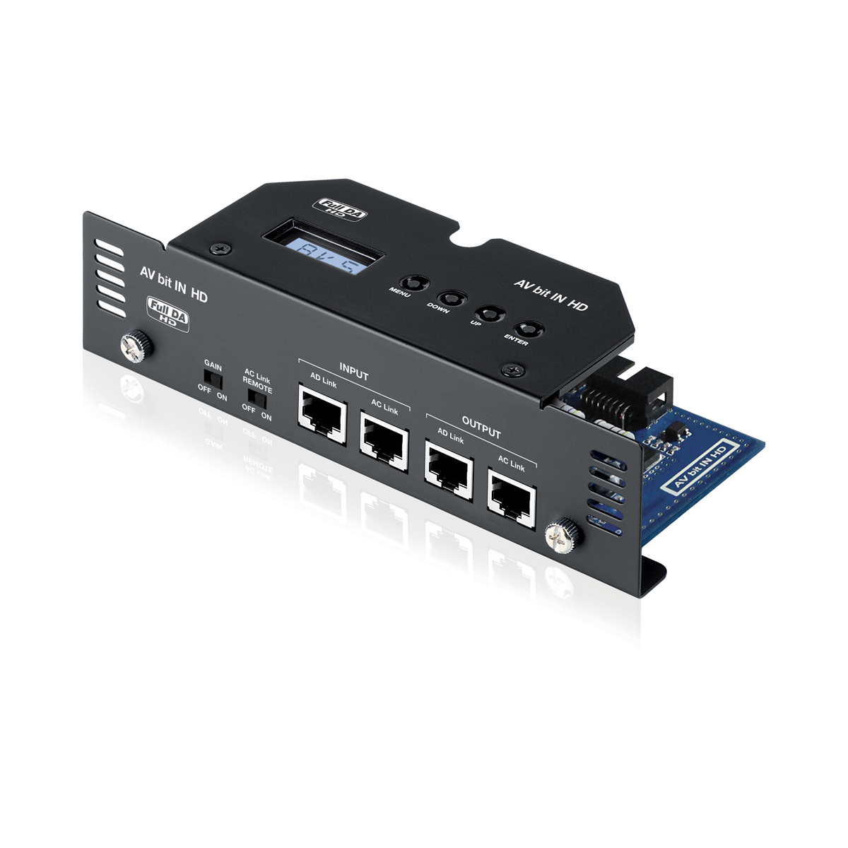 Digital interface for all AV amplifiers, for perfect digital connection with Audison bit processors provided with AD Link and AC Link connections. By mounting the AV bit IN “Digital Interface” onto the Voce amplifier series, through the AD Link connection the S/PDIF digital signal will get directly to the high quality internal D/A converters. After these, the signal becomes analog and is immediately amplified preventing it from deterioration due to the long paths. The result is extremely high quality music, not achievable with any other analog system. It offers one AD Link and AC Link input, as well as one AD Link and AC Link output in order to drive a multi-amplified system. Thanks to its digital panel with 3 character display and 4 push buttons, you can select the amplifier type, mono or stereo mode, and also the digital channel coming from the audio processor. AV bit IN HD features two new switches on the front panel: one provides you with the ability of turning off the gain control of the amplifier to achieve an improved Signal to Noise ratio. With the second switch you can control the DSP remote start function. Connection to amplifier: remove analog crossover module and insert AV bit IN module into the amplifier’s front side. It requires no external power supply.