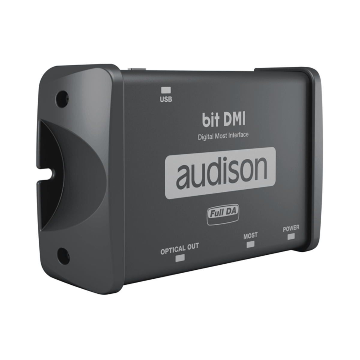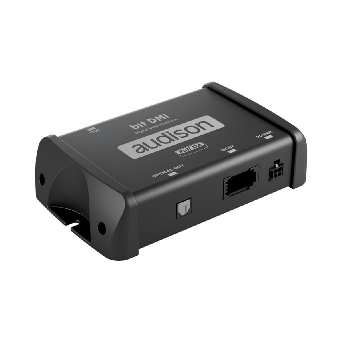 bit DMI is a digital interface for MOST systems, providing the ability to connect the Audison bit processors and the Audison amplifiers, equipped with digital input, to OEM multimedia systems in cars featuring the MOST technology based on optical fibre. Thanks to the digital connection, the signal can be transmitted without loss of quality, keeping the audio controls built in the OEM head unit – such as volume, balance and tone controls- as well as the hands-free kit, navigation system and parking sensors alerts unaltered.