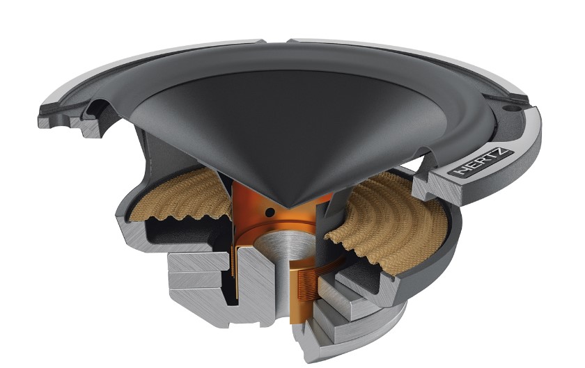 During these past few years the Mille line car audio woofers have been the choice of many enthusiasts looking for extreme performance; with ML 1650.3 Legend the Hertz designers increased again the limits of achievable performance for components designed for door installation. To get to these results, the R&D staff performed extensive in-car voicing sessions, after building several prototypes with the FEA simulation method and testing them with a wide array of measurements carried out with the Klippel® suite. To ensure extraordinary power handling and very high thermal stability even with tracks especially rich of bass frequencies, ML 1650.3 Legend features a 36 mm mobile voice coil. This size ensures the best compromise between power handling and high frequency response. The cone geometry has been subject of in-depth studies with FEA simulations and measurements performed with the Klippel Scan Vibrometer; all that led to the optimization of the V-cone® profile. In the subwoofers and in the woofers, to reproduce the lowest frequency spectrum, the cone needs to move a remarkable amount of air, so it is forced to make long excursions moving like a piston does. The V-cone® profile prevents the cone from deforming during its course, ensuring that the “piston” works in a correct position, maximizing the production of acoustic pressure.
