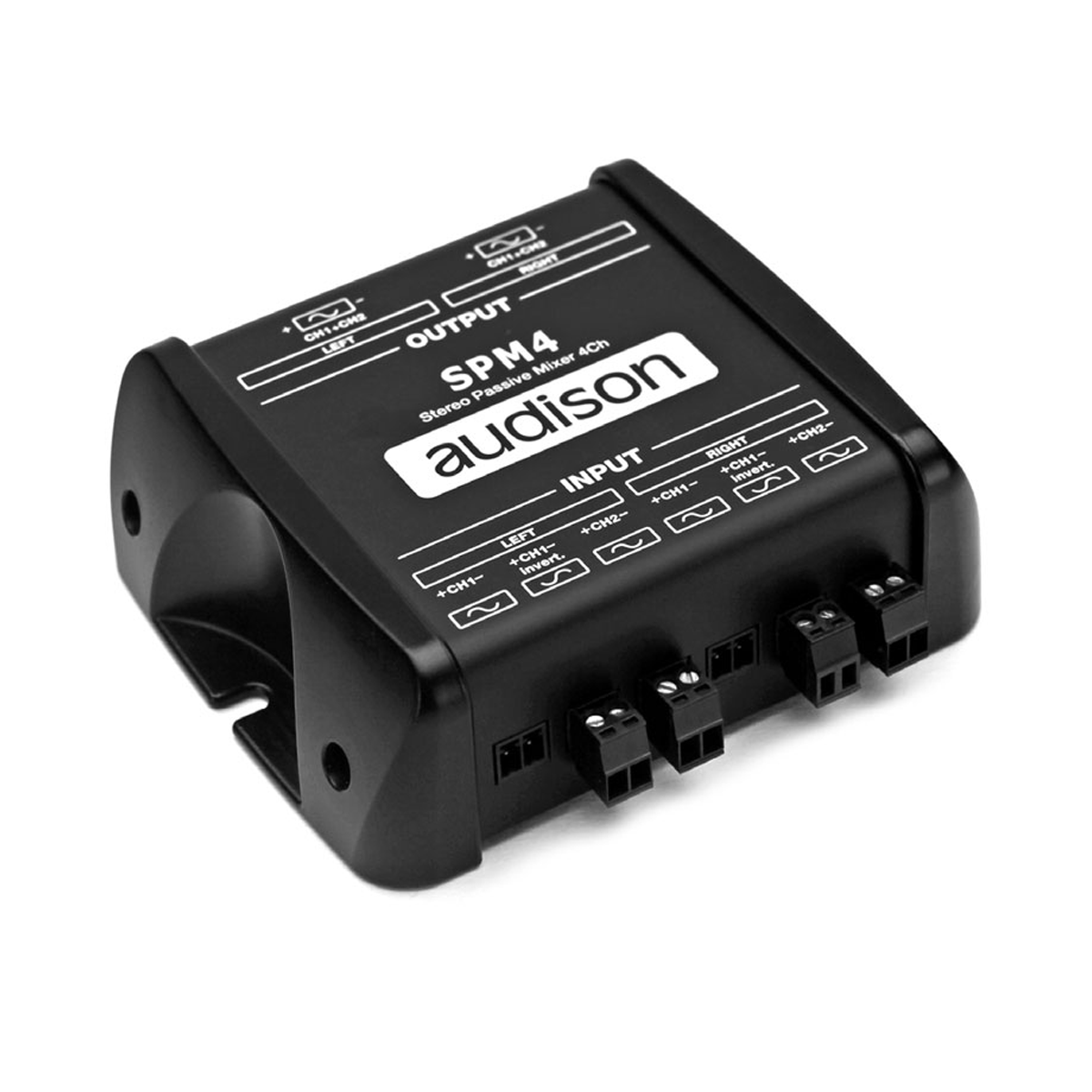 Stereo passive mixer (unpowered) featuring 4 input channels and 2 output channels, designed for active OEM multi-way systems where each speaker is powered by one specific amplified channel. SPM4 mixes audio through 4 audio transformers specifically developed to achieve very low distortion and highly linear acoustic response. SPM4 provides the ability to mix the midrange/woofer and tweeter channels coming from the amplifier and supply one single mid-high channel. The Ch1(L/R) channels feature two inputs, one features an inverting input compared to Ch2 (L/R) channels; the mixing process often gives better results when one of the two channels undergoes a 180° dephasing. SPM4 is especially recommended to extend the number of inputs of the Audison digital processors or amplifiers with built-in DSP because they feature a De-equalizer (De-Eq). In that case, any possible non-linear acoustic emissions due to the mixing of the pre-existing filtered channels are duly compensated.
