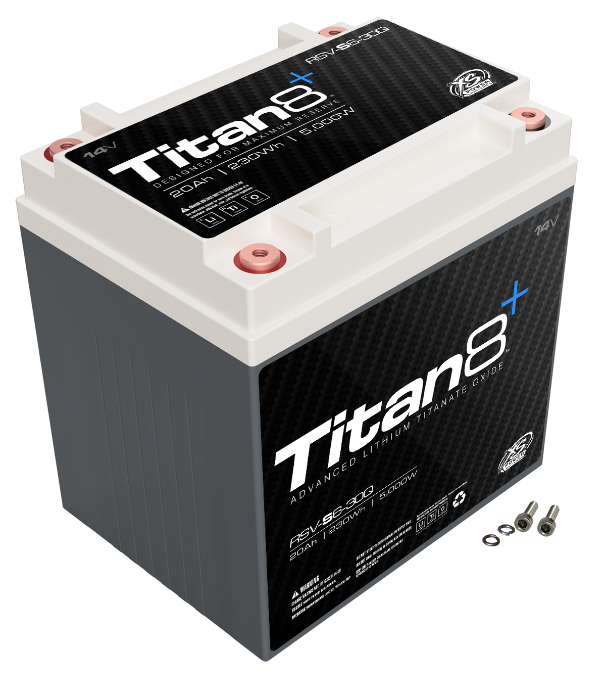 14V LTO battery. 500A cranking, 1,000A max, 5,000W, 20Ah (60Ah Pb eq). M6 hardware included.